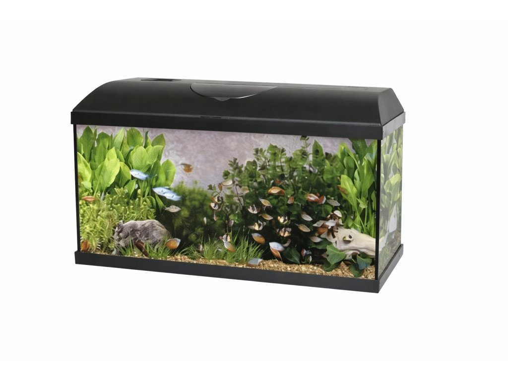 Set je opatřen plastovým krytem, který má ve vrchní části otevíratelnou klapnu k pohodlnému krmení rybiček. Horní hrany akvária jsou krytem chráněny proti poškození.