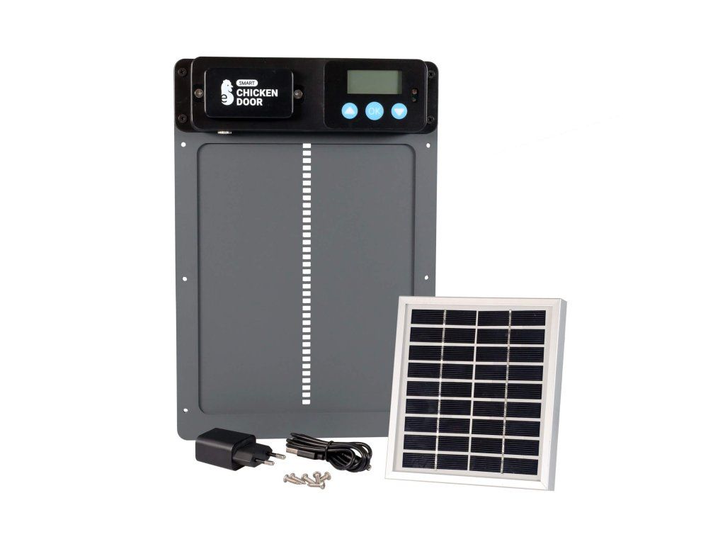 Napájení je u této varianty automatických dvířek pro slepice řešeno adaptérem 230 V + malým solárním panelem. Dvířka lze napájet také pomocí dvou baterií AA (nejsou součástí této varianty).