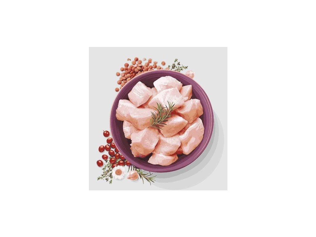 Složení: čerstvé kuře (70 %), hrachový protein, červená čočka, pohanka (4 %), přírodní aromata, kuřecí tuk, lososový olej (1 %), chlorid sodný, chlorid draselný, sušená řasa (Ascophyllum nodosum, 0,5 %), protein okřehku (Lemna) (0,5 %), hrachová mouka, sušený rakytník řešetlákový (0,2 %), sušený kořen zázvoru (0,1 %), sušené borůvky (0,1 %), sušený rozmarýn (0,1 %), sušená klikva (vaccinium oxycoccos) (0,1 %), sušený tymián (0,1 %), pivovarské kvasnice (zdroj mannan-oligosacharidů, 0,015 %), kořen čekanky (zdroj frukto-oligosacharidů, 0,015 %), juka schidigera (0,008 %).