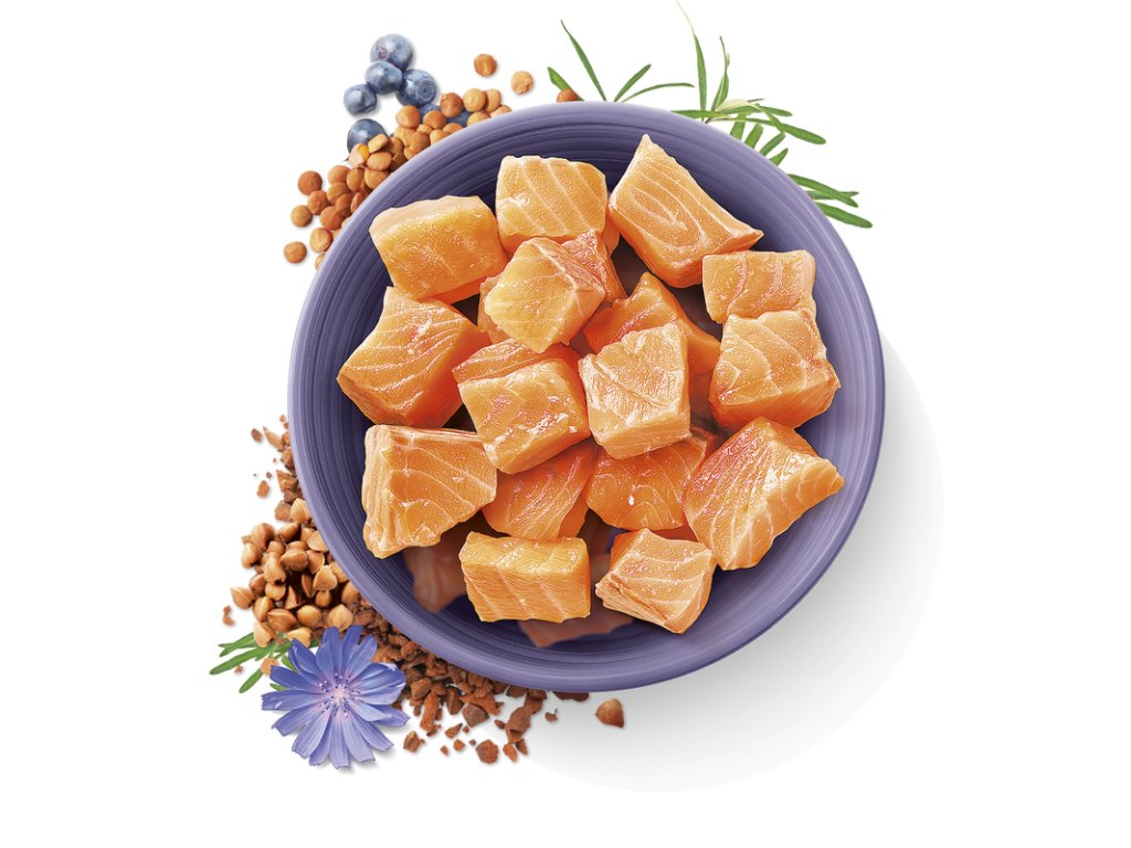 Složení: čerstvá ryba (70 %), hrachový protein, červená čočka, pohanka (4 %), přírodní aromata, kuřecí tuk, lososový olej (1 %), chlorid sodný, chlorid draselný, sušená řasa (Ascophyllum nodosum, 0,5 %), protein okřehku (Lemna) (0,5 %), hrachová mouka, sušený rakytník řešetlákový (0,2 %), sušený kořen zázvoru (0,1 %), sušené borůvky (0,1 %), sušený rozmarýn (0,1 %), sušená klikva (vaccinium oxycoccos) (0,1 %), sušený tymián (0,1 %), pivovarské kvasnice (zdroj mannan-oligosacharidů, 0,015 %), kořen čekanky (zdroj frukto-oligosacharidů, 0,015 %), juka schidigera (0,008 %).