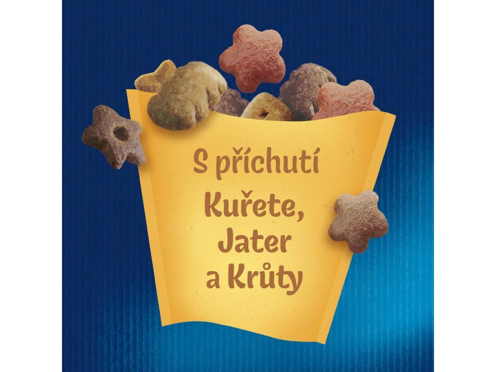 Složení: maso a vedlejší výrobky živočišného původu (35 %), obiloviny, oleje a tuky, bílkovinné extrakty rostlinného původu, minerální látky, cukry, kvasnice, ryby a vedlejší výrobky z ryb ( odpovídající 50 % rehydratovaného masa a vedlejších výrobků živočišného původu s min. 26 % masa, 0,5 % kuřete, 0,5 % jater a 0,5 % krůty)