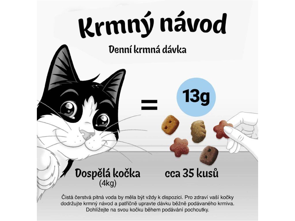 Krmný návod (Doporučená denní dávka): podávejte jako pamlsek nebo odměnu. Čistá čerstvá pitná voda by měla být vždy k dispozici. Pro zdraví vaší kočky dodržujte krmný návod a upravte dávku běžného krmiva.