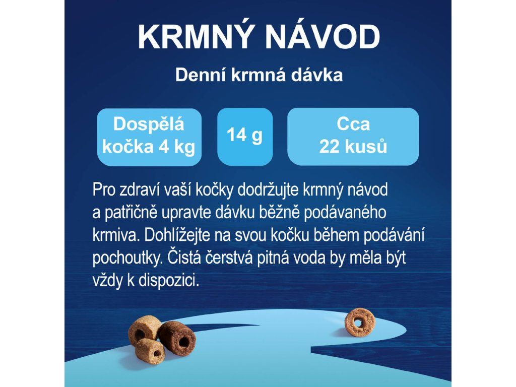 Krmný návod (Doporučená denní dávka): Denní krmná dávka pro dospělou kočku 4 kg: 14 g nebo přibližně 23 kousků. Čistá čerstvá pitná voda by měla být vždy k dispozici. Pro zdraví vaší kočky dodržujte krmný návod a upravte dávku běžného krmiva. Dohlížejte na kočku během podávání pamlsků.