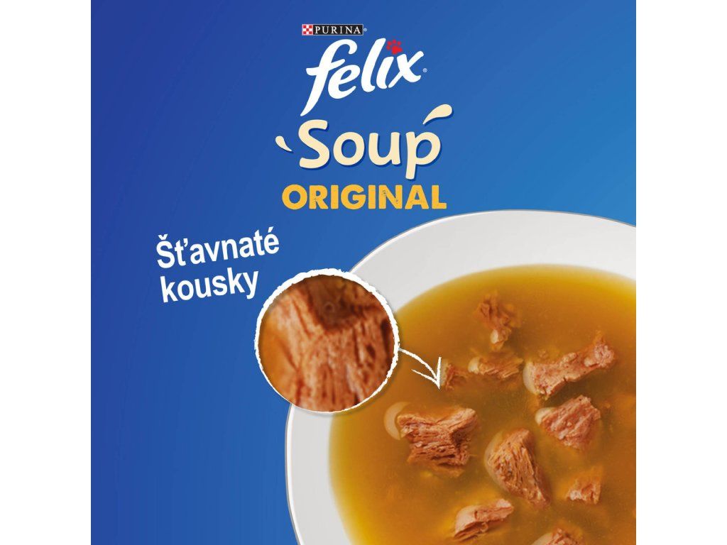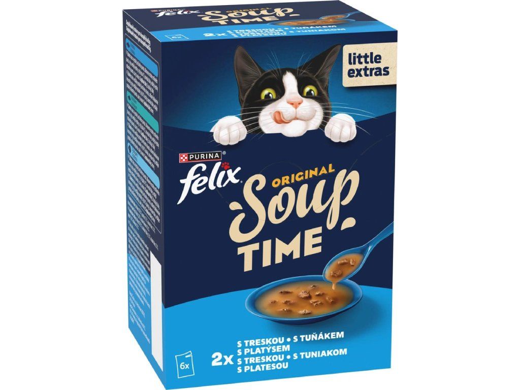 FELIX Soup Lahodný výběr z ryb (treska, tuňák, platýs) je ideálním doplňkem stravy pro každou kočku, která miluje tekuté pochoutky. Tato lahodná polévka s jemnými kousky ryb slouží jako rychlá a chutná svačinka, kterou stačí jen nalít do misky. Díky vysokému obsahu vlhkosti je skvělým pomocníkem při hydrataci nebo jako lákavé dochucení granulí.