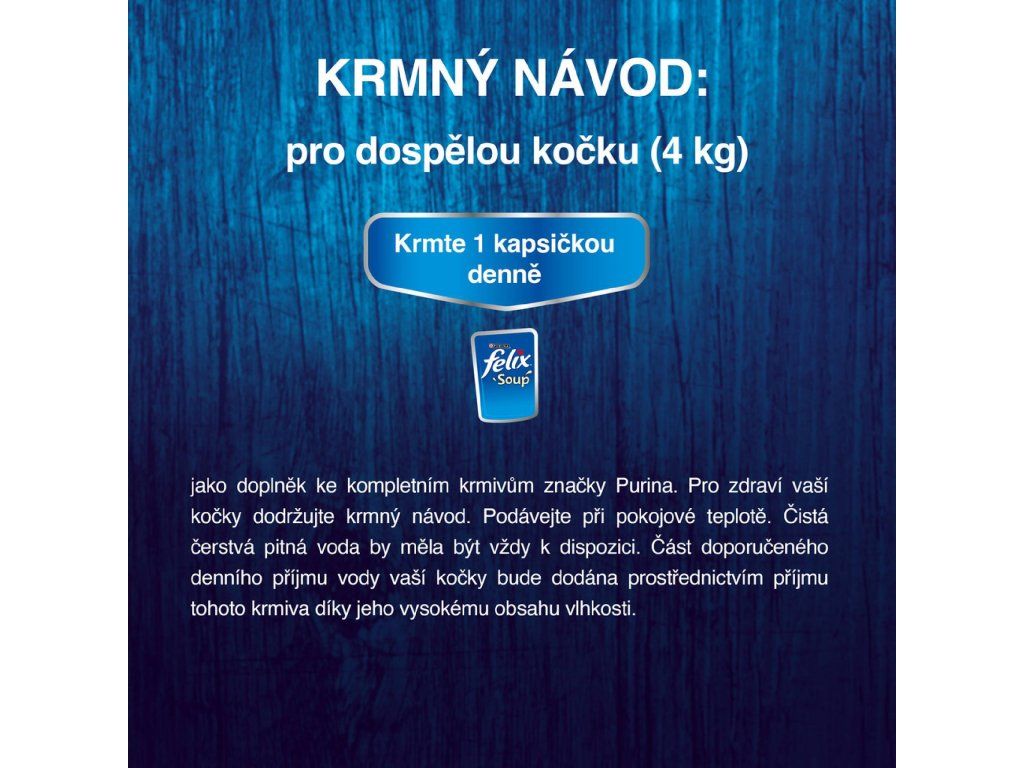 Krmný návod: Podávejte při pokojové teplotě jako doplněk k běžnému krmivu. Pro dospělou kočku (4 kg) podávejte jednu kapsičku denně. Vždy zajistěte přístup k čerstvé pitné vodě. Uchovávejte v suchu a chladu.