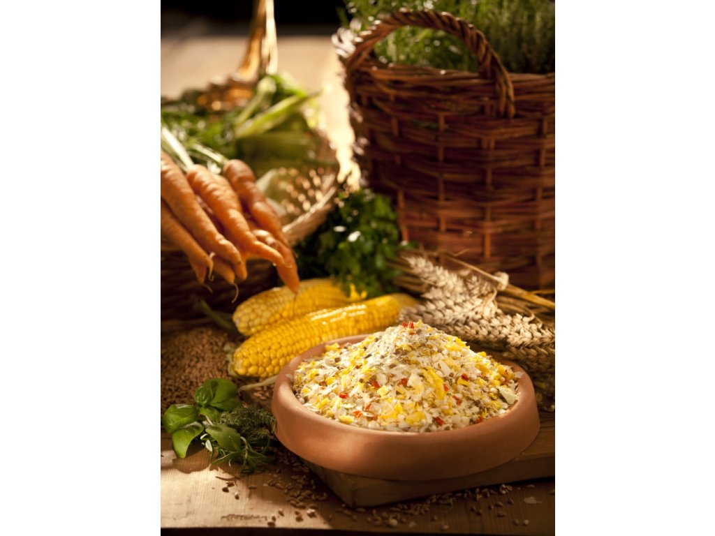 celozrnné kukuřičné vločky, kukuřičná mouka, celozrnné pšeničné vločky, celozrnné ovesné vločky, hrachové vločky (6 %), rýžová mouka (extrudovaná), mrkev* (3 %), proso (pufované), uhličitan vápenatý, monokalciumfosfát, chlorid sodný, plod černého bezu, saturejka, majoránka, rozmarýn, šalvěj, tymián, anýz, bazalka, fenykl, květ černého bezu, květ levandule; (sušené bylinky celkem: 0,11 %); *) sušené.