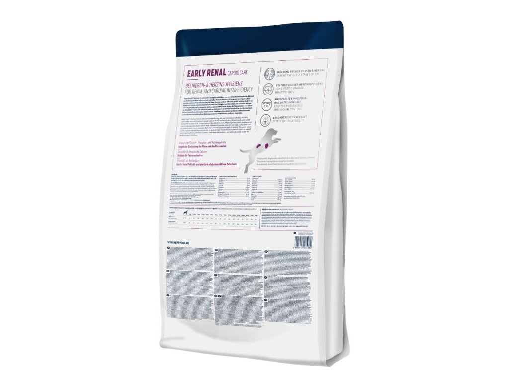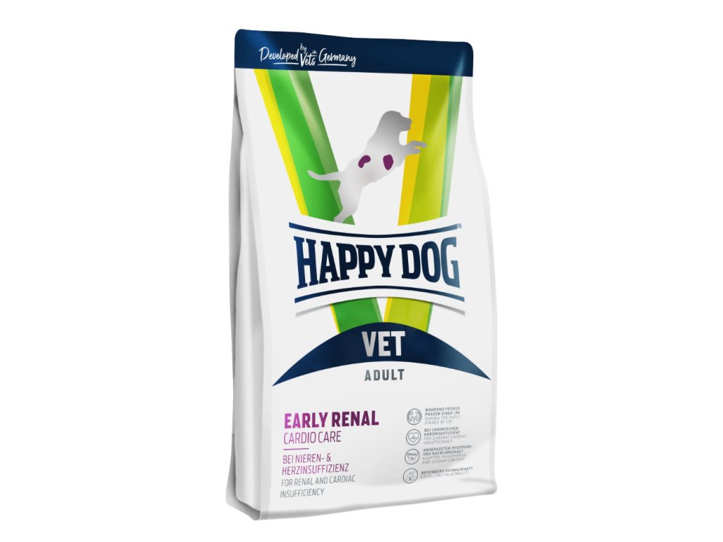 Happy Dog VET Diet Early Renal & Cardio Care se nasazuje k odlehčení ledvinám při akutní a chronické nedostatečnosti ledvin a je vhodná zejména v raných stadiích CRI. Tato dieta se vyznačuje těmto potřebám speciálně přizpůsobeným obsahem lehce stravitelných bílkovin a taktéž fosforu a sodíku. Zvláště chutná receptura obsahuje jako zdroj bílkovin škvarky, lososa a rýžové bílkoviny. Snížený obsah sodíku doplněný o živiny důležité pro srdce činí z této diety ideální podporu při chronické srdeční nedostatečnosti.