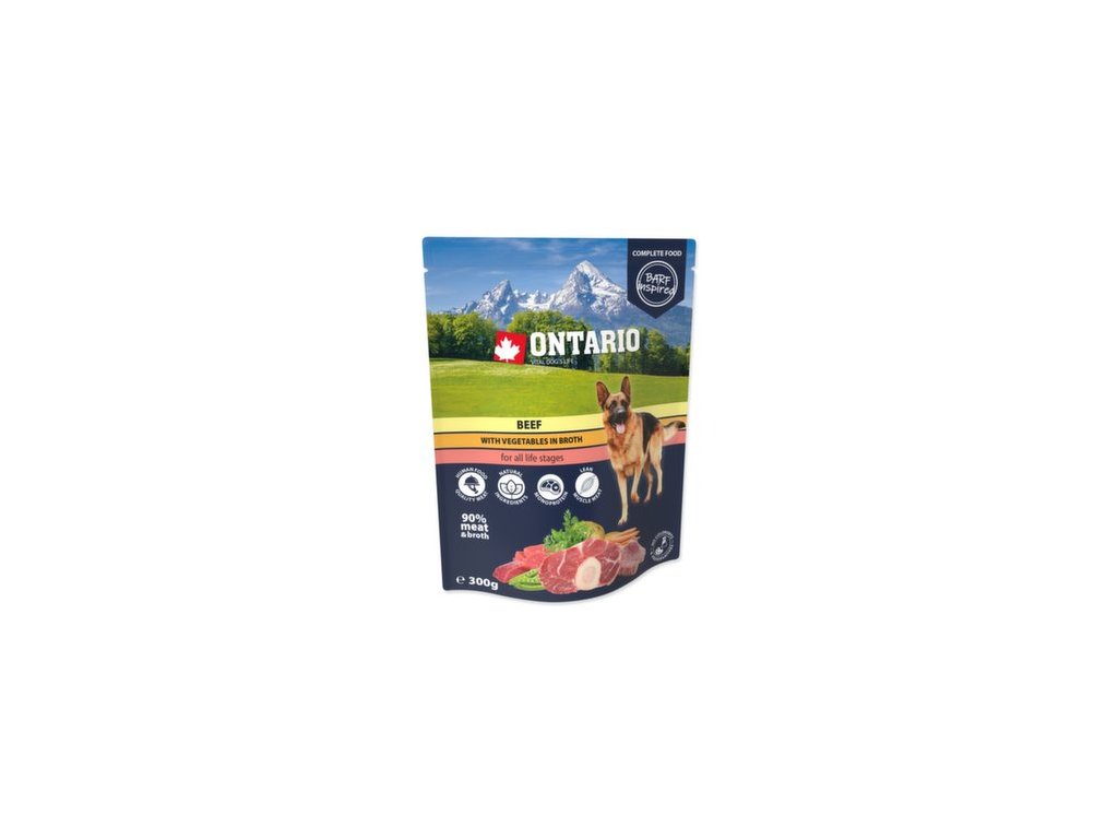 Hovězí maso se zeleninou ve vývaru. Monoproteinové, kompletní krmivo pro psy všech věkových skupin (od 2. měsíce věku) inspirováno Barfem.