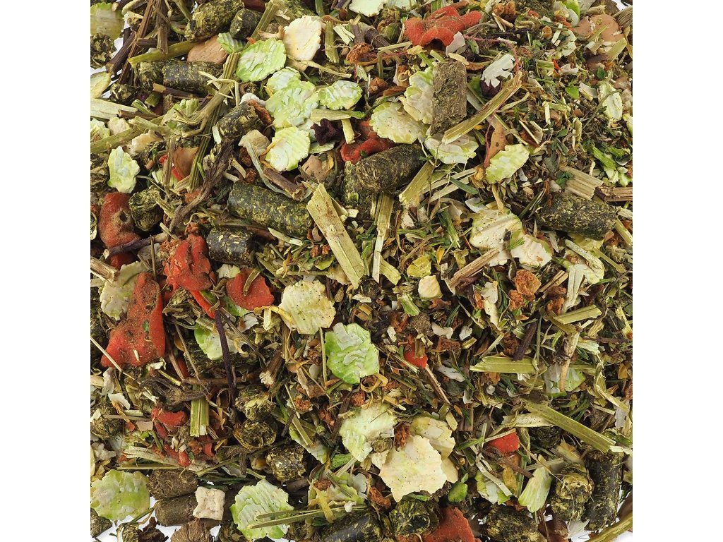 Složení: sušená vegetace rostoucí na trvalých pastvinách podhůří Alp, hrachové vločky 11,4 %, zelenina (sušená mrkev, sušená petržel 2,1 %, sušený pastinák, sušená červená řepa), byliny (sušené květy měsíčku lékařského 2 %, sušené kopřivy, sušená máta peprná 1,1 %, sušená meduňka, sušené pampelišky, sušený heřmánek), sušená jablka 4 %, vločky z bobu obecného 3,3 %, sušená vojtěška, lněná semena, semena černého kmínu, semena fenyklu.