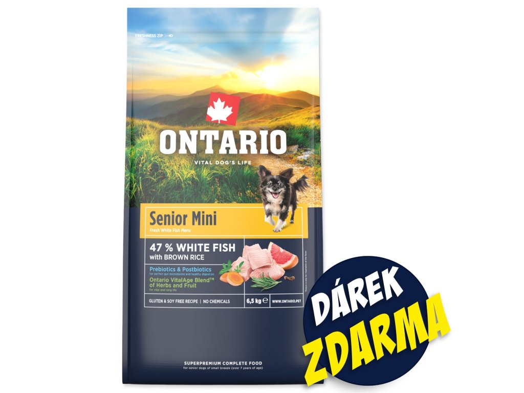 Ontario Senior Mini Fish & Brown Rice 6,5 kgSuperprémiové, kompletní krmivo pro starší psy malých plemen (od 7 let věku).