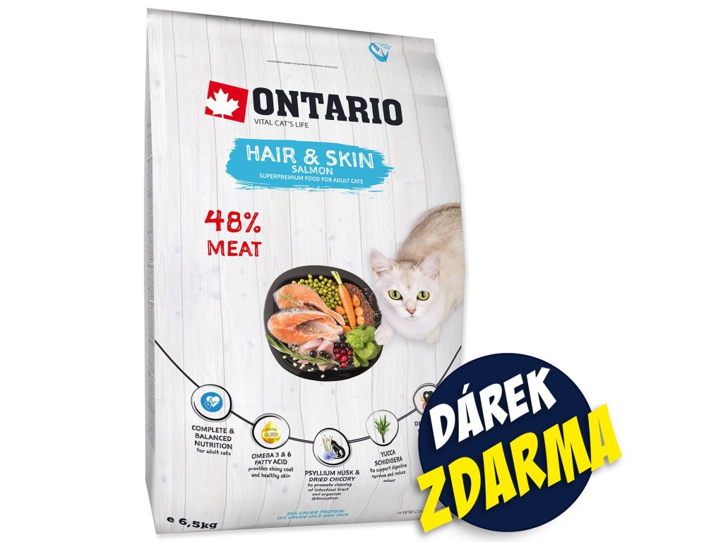 Krmivo Ontario Cat Hair & Skin 6,5 kg + Kapsičky ZDARMA