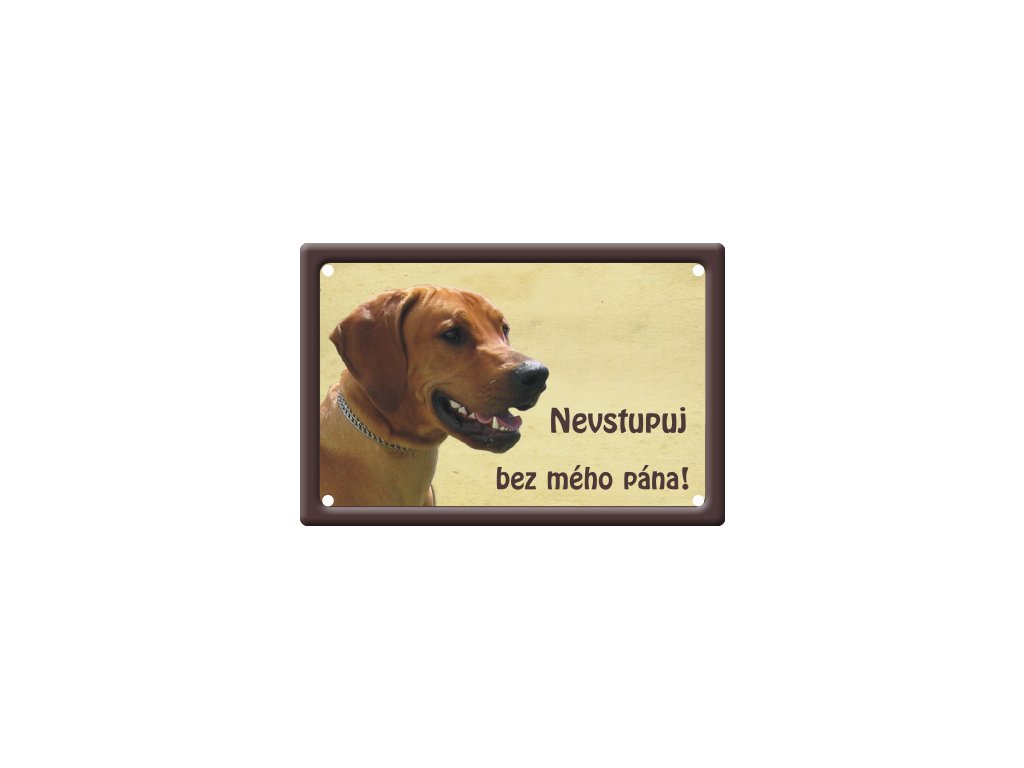 Plechová psí cedulka pro venkovní i vnitřní použití v rozměru 150 x 100 mm, v rozích 4 díry pro uchycení, prolisovaný zdobný okraj tabulky, potištěný plech.