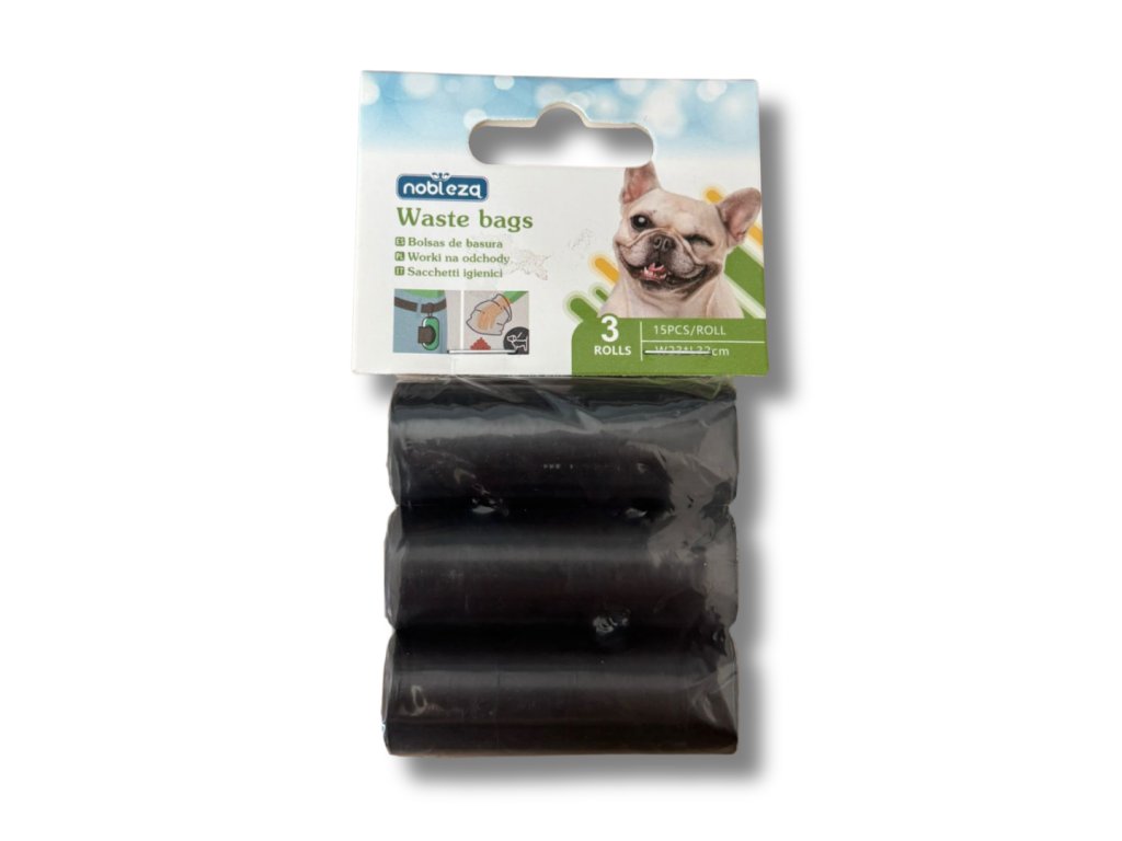 Pytle na psí exkrementy. 3 role po 15 kusech. Velikost sáčku 23x32 cm.