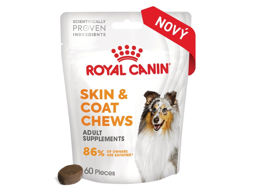 Doplněk stravy ROYAL CANIN® SKIN & COAT CHEWS ADULT SUPPLEMENTS je navržen tak, aby podporoval zdraví kůže a lesklou srst vašeho psa. Po 2 měsících používání podle interní studie společnosti Royal Canin zaznamenalo 86 % spokojených majitelů. Kůže je největším orgánem psa a první obrannou linií proti vnějším vlivům, proto je důležité zajistit jí správnou výživu. Tento doplněk obsahuje vědecky ověřené složky, jako jsou omega-3 a -6 mastné kyseliny, zinek, GLA a vitamíny, které posilují kožní bariéru a podporují zdravou výměnu kožních buněk.
