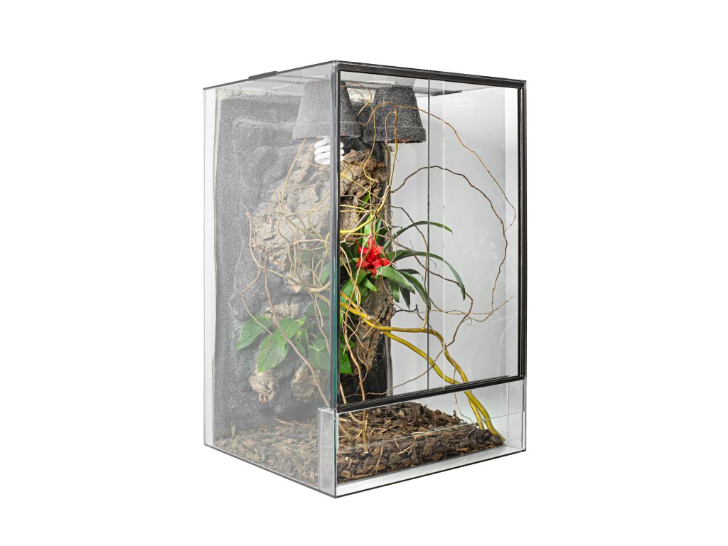 Skleněné terárium s korkovým 3D pozadím osazeným rostlinami o rozměrech 50x40x60 cm je ideální volbou pro chov terarijních živočichů žijících na větvích.