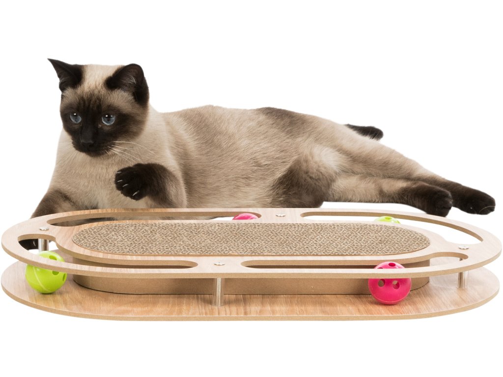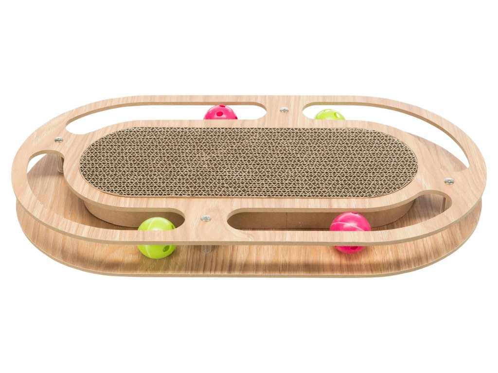 Škrábací karton v dřevěném rámu, s catnipem a hračkami, 45x4x25cm