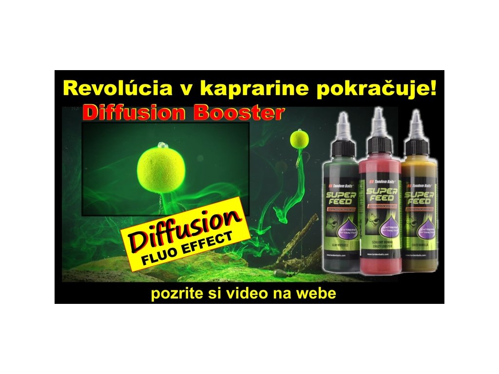 Fluo efect je speciálně vyvinut s vysokým obsahem příchutí, extraktů a výraznou chutí. Důležité však je, že kromě těchto atraktivních směsí pro ryby obsahuje i dobře viditelné barvivo , které se po namočení do vody postupně uvolňuje, vytváří tak velmi silný fluorescenční mrak a láká nám ryby is velké dálky na naše lovné místo. Žádná ryba takové návnadě neodolá. Diffusion booster je skvělý pro zatraktivnění háčková nástrah ale i zakvapnutie method feedrové krmítka. Množství neodolatelných příchutí ze kterých si vybere opravdu každý. Lahvička má speciální mechanismus, při kterém stačí jednoduše pootočit víko a můžete přesně nadipovať nástrahu, následně bezpečně zavřít.