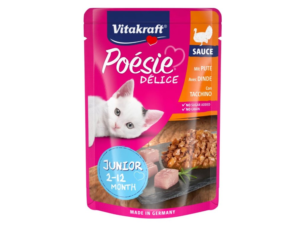 Kompletní krmivo v kapsičkách uzpůsobené denním nutričním požadavkům koťat. Viditelné kousky krůtího masa ve vydatné porci omáčky. Neobsahuje konzervanty, přidaná ochucovadla a barviva.