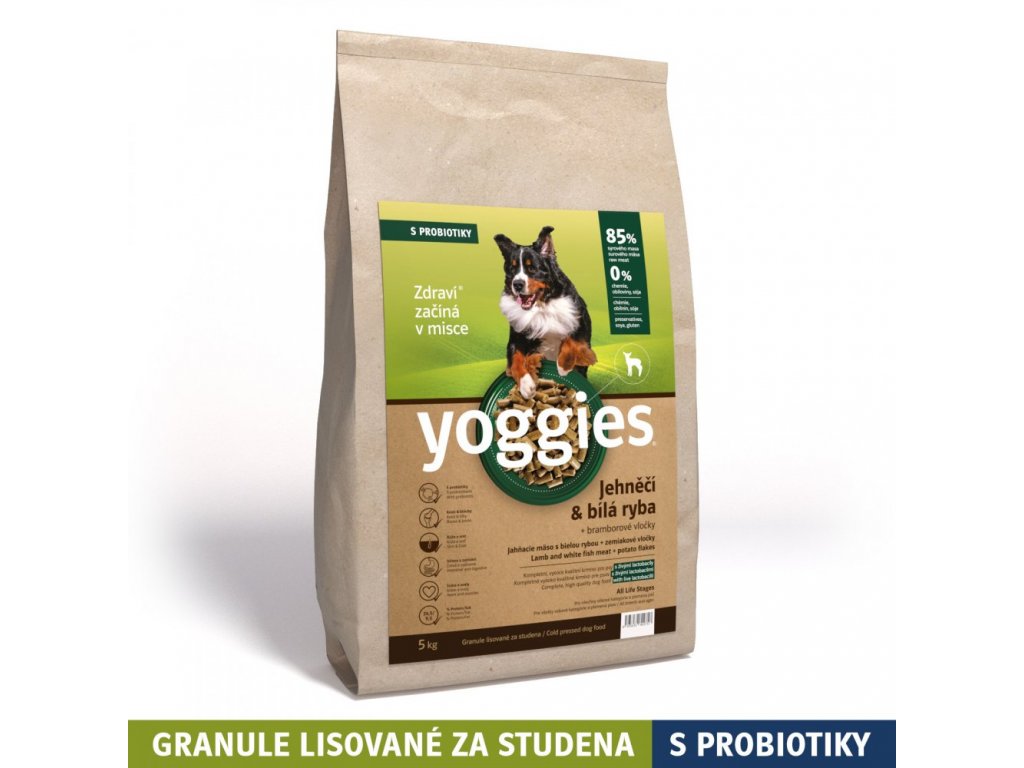 jehněčích granulí Yoggies jsou kvalitní jehněčí maso a maso bílé ryby (žádná masokostní moučka). Díky těmto hlavním surovinám jsou granule skvěle stravitelné a je možné je po poradě s veterinářem používat i při různých potížích u psů jako je např.cukrovka, problémy s trávením, játry, ledvinami i při různých dietách.