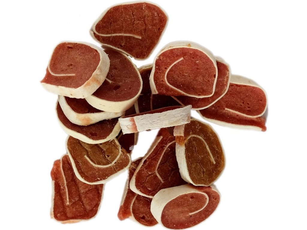 Závitky ze sušeného jehněčího masa (58 %) v kombinaci s treskou (16 %), střední formát o průměru cca 3 cm.